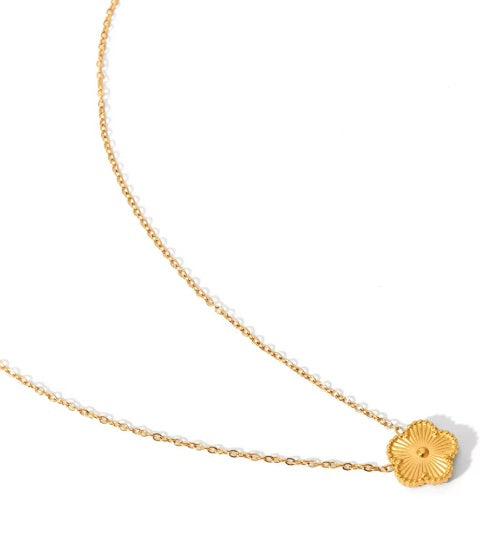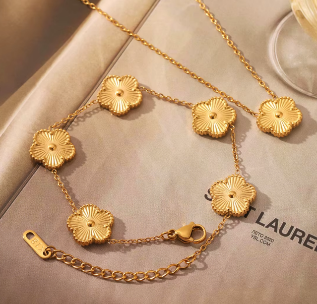 Låt din stil blomstra med detta eleganta halsband i rostfritt stål, bestående av ett halsband med vackra guldfärgade blommor. Den präglade ytan ger ett lyxigt djup och fångar ljuset på ett subtilt men iögonfallande sätt.
