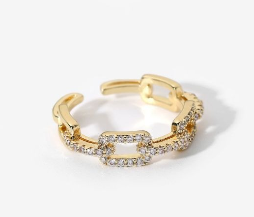Ge din smyckessamling en elegant uppgradering med denna exklusiva ring i guldpläterad metall. Ringen har en unik kedjeliknande design där varje länk är prydd med gnistrande kristaller för maximal lyster. Den öppna, justerbara designen gör att ringen passar de flesta storlekar bekvämt.