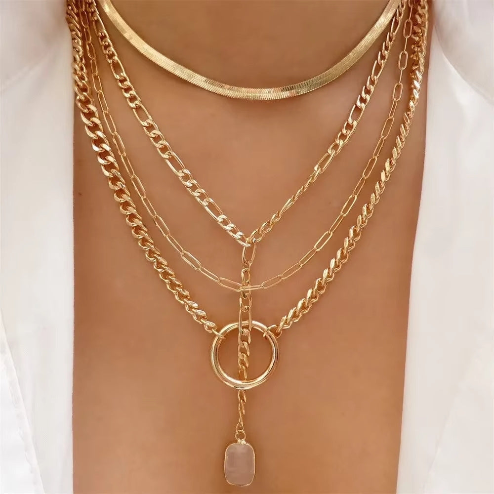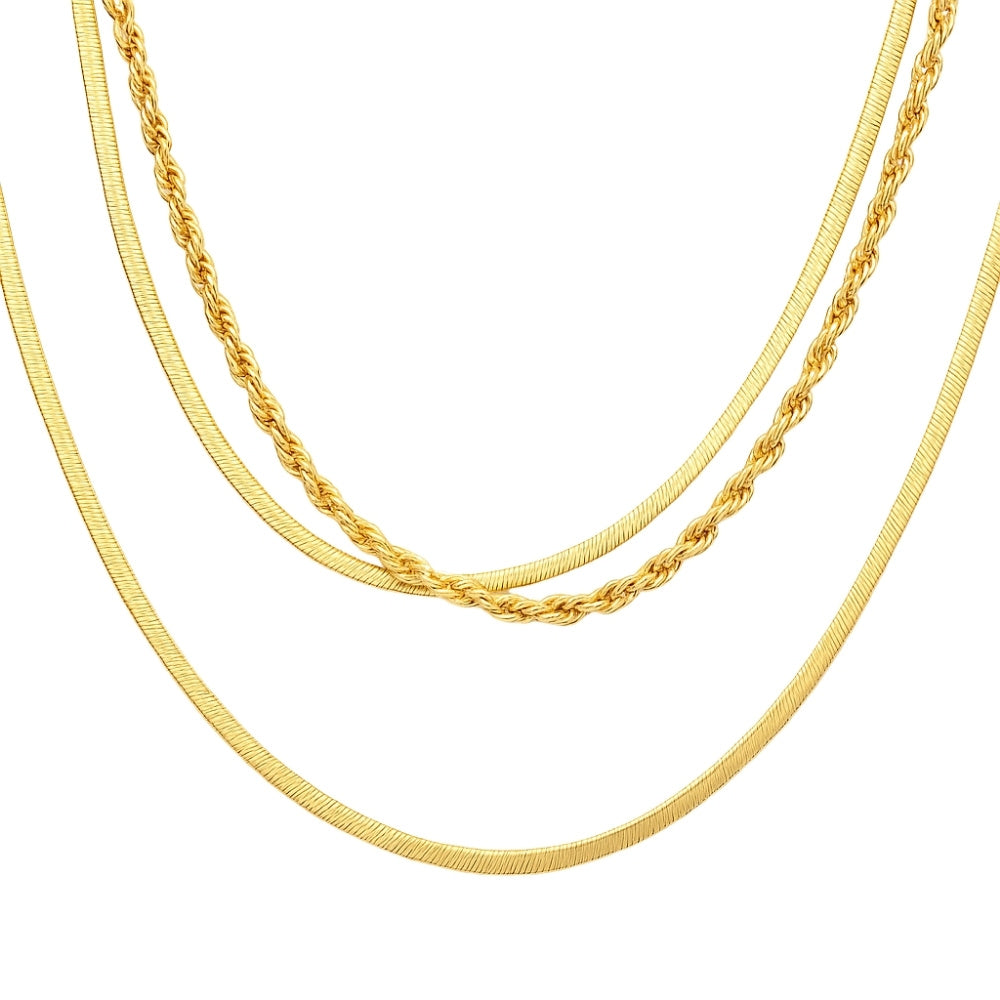 Ge din look en omedelbar stilhöjning med detta 3-i-1 multilager-halsband i guldfinish. Välj bland tre olika designer – från minimalistiska länkar till blickfångande hängsmycken – och skapa en sofistikerad outfit. Perfekt att bära till allt från vardagsoutfits till fest.